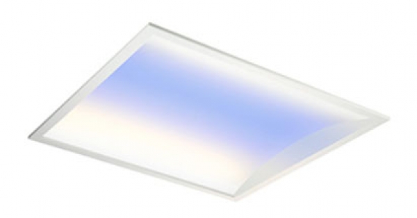 埋込形LEDベースライトの器具内部に「青色」「白色」「電球色」の3色のLEDを配置し,この3色の光が乳白のカバーを照射し,光のグラデーションで天井に空のイメージを表現する.青空や夕焼け空を表現することができ,移り変わりをタイムスケジュールに記憶させて自動で変化させることもできる. 製造:東芝ライテック株式会社 〒212-8585川崎市幸区堀川町72-34 電話(044)331-7558