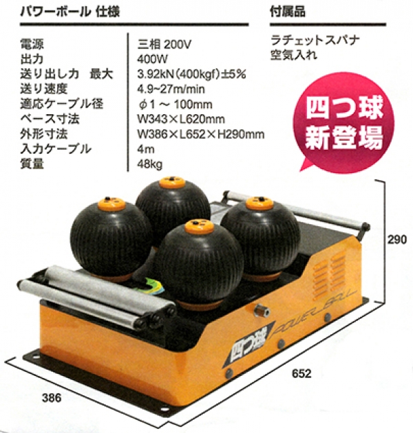四つ球のインバータ制御連動式ケーブル中間送り機.管路の出入り口やドラムからの送り出しに最適である. 製造:育良精機株式会社 〒300-4297 茨城県つくば市寺具1395-1 電話(029)869-1212