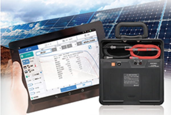 太陽光パネルの異常を素早く発見することができるI-V カーブトレーサ. 〔特長〕 ① 1ストリングを1 秒でスピーディに測定する.また,自動測定機能により,機器操作なしでプロービングするだけでストリングを次々に測定できる.②測定結果をタブレットに表示するため,各特性グラフを精細に確認できる.また,異常があると思われるカーブは色を変え,警告マークを表示し,想定される異常原因を示唆する. 〒386-1192 長野県上田市小泉81 電話(0268)28-0555