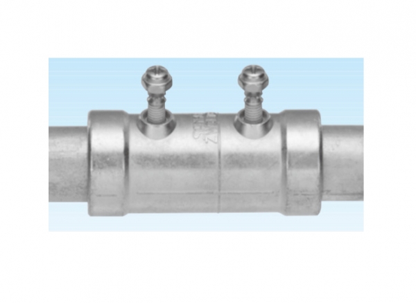 薄鋼電線管用の防水ねじなし型薄鋼カップリングである. 〔使用方法〕 ①トルク小ねじの締付けは,頭が折れるまで行う. ②トルク小ねじの折れた頭部に対して,安全保護のための保護キャップが使用できる. ③トルク小ねじのかわりに六角小ねじ(SUS製)を取付けたものも特注で受注する. ④VL付きは,ねじなし薄鋼電線管接続用.ねじ部は切断して使用する.