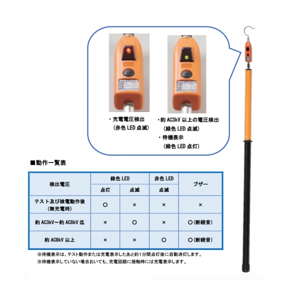 交流特別高圧回路(交流電車線:在来線,新幹線共用型)用検電器で,発音・発光により充電の有無を表示し,検電待機表示(無充電表示)を設けた検電器である.動作表示は電圧の大きさにより2段階(緑色と赤色LEDの点滅発光)により自動で切り替わる.充電電圧検出は赤色LED点滅,約AC3kV以上の電圧検出は緑色LED点滅,待機表示は緑色LED点灯.使用電圧範囲:AC20kV~80.5kV. 〒661-0976 兵庫県尼崎市潮江5-8-17 電話(06)6429-6144