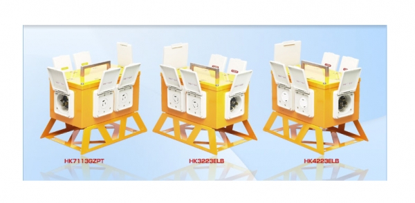 現場での電源増設や移設に対応可能な構造を持ち,屋外での使用にも適している鋼板製で,防水タイプの移動用分岐ボックスである.入力側にある逆芯タイプの防水形フランジインレットにコードコネクタボディを接続することで,4か所のコンセントに電源を供給する.カバー全閉時にJIS C0920(電気機械器具の外郭による保護等級)IP44相当の防水性能を有している. 電話(03)3720-9621