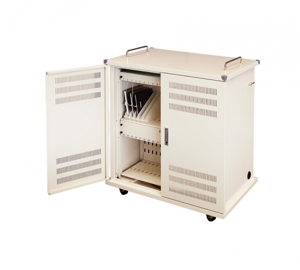学習用端末を児童生徒一人に一台持たせる政策に対応するタブレット収納キャビネットである. 最大44台のタブレット端末やノートパソコン端末を収納でき,一般的なコンセント(15A 100V)では容量が足りずブレーカが落ちてしまい充電ができないが,本製品は同時に輪番充電できる.生徒の安全を考えた端末接続後に通電させる一括電源スイッチ付. 電話(052)930-6373