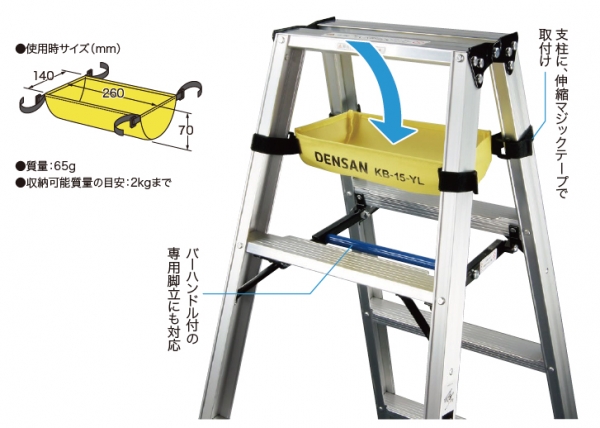脚立に取付ける便利袋にミニタイプがラインアップ.脚立作業中に工具や材料などを置くことができる. 〔特長〕①長尺脚立に最適である.②二段目にバーハンドルのついた専用脚立にも取付け可能.③脚立支柱に伸縮マジックテープで取付ける.④取付けたまま脚立の開閉が可能.⑤イエローとブラックの2種類. 電話(072)988-3814