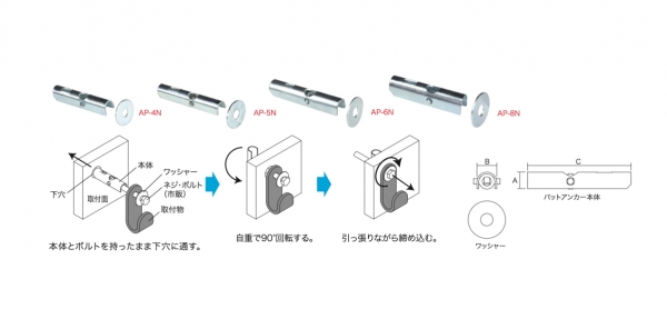 中空壁面への器具や配管の取付けに最適なネジ・ボルトなしタイプのアンカーである. 〔特長〕 ①建築内装の軽量鋼間柱や壁面を壊さず取付けが可能.②下穴から水平に差し込んで,壁裏側の本体が垂直に立ち,壁面と取付け物をしっかり固定することができる. 電話(072)988-3814