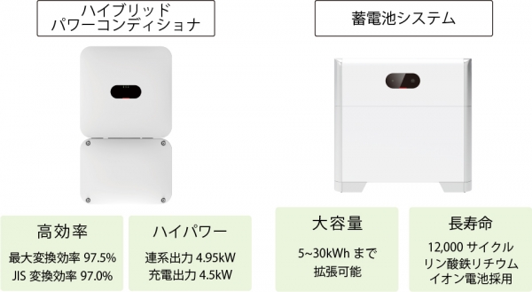 ハイブリッドコンディショナと蓄電池システムがセットになったハイブリッド蓄電システムである. 〔特長〕①奥行き15cmのコンパクトサイズなので屋外・屋外ともに設置に困らない.②複数の運転モードがある.経済性を優先する「TOUモード」,できるだけ太陽光発電で作った電気を使う「グリーンモード」など. 電話(03)5425-1258