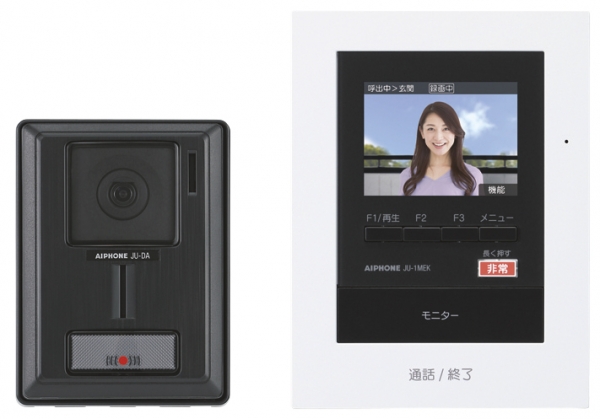 モニター付親機の非常ボタンを長押しすると,玄関と室内に非常事態を知らせることができるインターホンである. 〔特長〕①非常ボタンを押すと玄関子機が鳴動し点滅する.②空間に調和するシンプルなデザインである.③来訪者の画像を1件あたり6画面,最大40件まで自動録画する.④ズーム操作により約1.5倍で表示できる. 電話0120-141-092