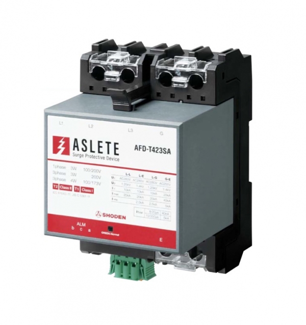新分離器内蔵・電源用SPDであるAFD-TシリーズのELCB用接地端子付である.型番AFD-T223EA. 〔特長〕①分電盤内にD種接地とELCB接地の2種類の接地端子がある場合でも1台のSPDで保護できるよう二つの独立した接地端子を有している.②分離器内蔵による省スペース化と配線工数の低減.③安全にSPDプラグ交換可能. 電話(03)5819-8373