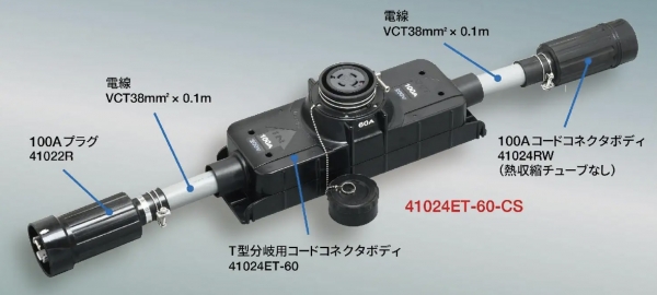 38sq電線から60Aコンセントを通じて14sq電線に分岐(ダウンサイジング)することができる100A定格のT型分岐用コネクタボディのコードセット品である.T型分岐用コネクタボディの両端に,それぞれ38sq電線で100A定格のプラグとコードコネクタボディが結線されている.高容量電源設備の新設時に組み入れておくことで,電源移動をともなうようなレイアウト変更の際に結線作業の省力化ができる. 電話03-3720-9621