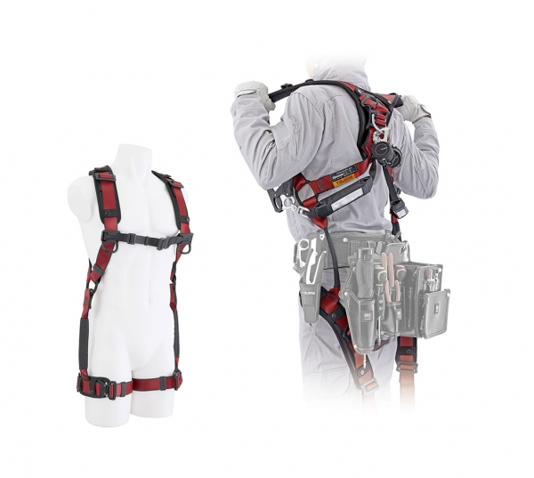 腰に道具を付けたまま脱ぎ着ができる新様式のハーネスである. 低所と高所を行き来する作業者は羽織る(ハオル)ようにハーネスを脱ぎ着できるためタイムロスがなく安全に作業することが可能.形が崩れず脱ぎ着しやすいパッド付.腰道具の上を通るベルトが細幅になっているので腰道具の隙間にベルトを逃すことができる. 電話0120-125577