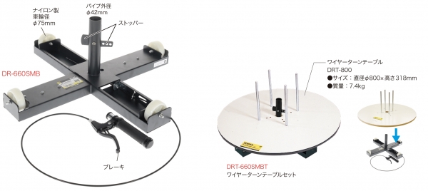 ドラムの回転を制御できるブレーキ付きである.最もよく使われるドラムサイズに対応. 四本脚なので倒れない.ストッパー付き.250kg(直径φ1150mm)までのドラムを楽々回転.回転受部が大きい車輪(φ75mm)でスムーズなドラムの回転が可能. 電話072-986-5900