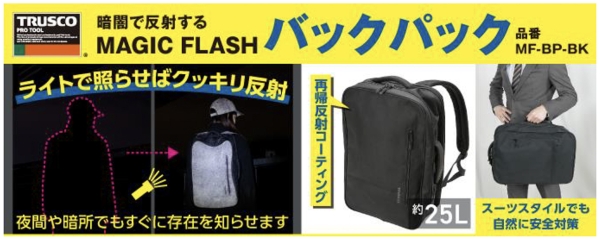 高性能再帰反射コーティング素材を採用することで,光に当たると一瞬で輝き,夜間や暗所での安全対策に優れるバックパックである.〔特長〕①普段は目立たないので普通のバックとして使うことができる.②大容量(約25L)・軽量なので,荷物が多くてもストレスなく持ち運びが可能.③表面には撥水加工を施しており,汚れにも強く現場作業者にも最適.④取り出し回数が多い物にも対応できるスマートポケット. 電話 03-3433-9840