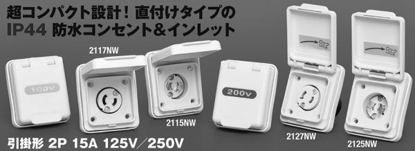 機械器具などの盤の内外に最小寸法で連節取付けができる,電源をプラグへ供給するための防水コンセントである防水形機器用アウトレットに引掛形2P15A定格品がラインナップ.また,電源ケーブルをなくしたい移動機器などに取付け,給電側のコードコネクタボディを利用して,外部給電の取込口として電源を受電する防水形フランジインレットシリーズに新しくコンパクト設計の引掛形2P15A定格品がラインナップ.