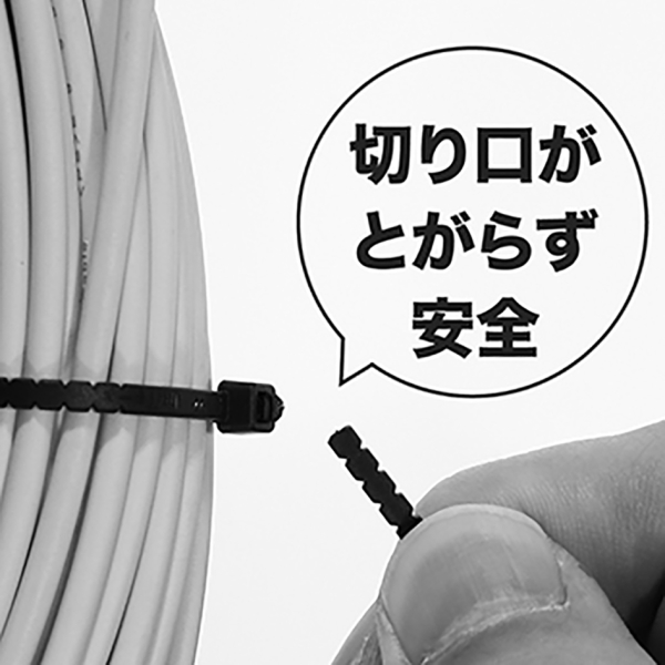 ニッパーを使わず,手でちぎれるケーブルタイである.余ったバンド部を手でねじってちぎれる.〔仕様・特長〕①長さ:102mmタイプ(結束径:8~20mm),150mmタイプ(結束径:8~35mm),200mmタイプ(結束径:8~45mm)の3種類.②入数:100本.③切り口がとがらず安全.④簡易ホルダー付,前面の小窓からケーブルタイを素早く取り出せる.⑤材質:ナイロン66.⑥使用温度範囲:-10℃~80℃. 電話 0729-86-5900