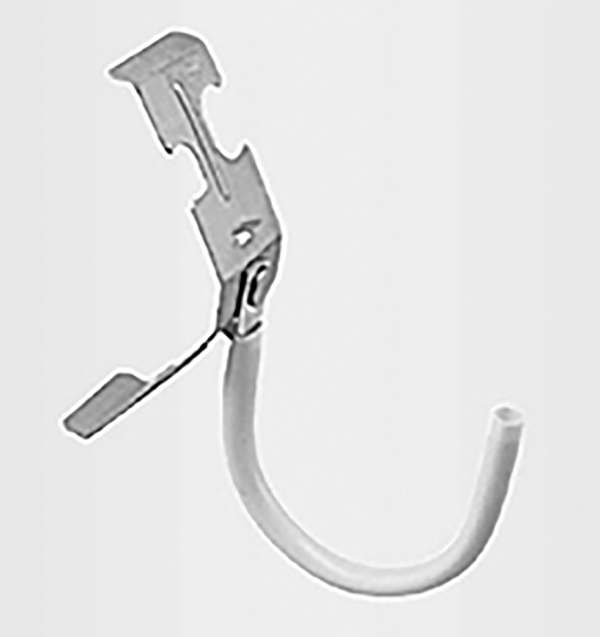 天井や天井近くに設置されたコンセントにプラグを挿した際,プラグから垂れ下がる電線をフック部に引っかけることで,コンセントやプラグにかかる荷重を低減させることができる器具である.吊りボルトに固定するグリップ部とケーブル支持のフック部が一体化しているため,組合わせの手間がいらない.フック部はケーブル保護用の軟質塩化ビニル被覆付き. 電話 03-3720-9621