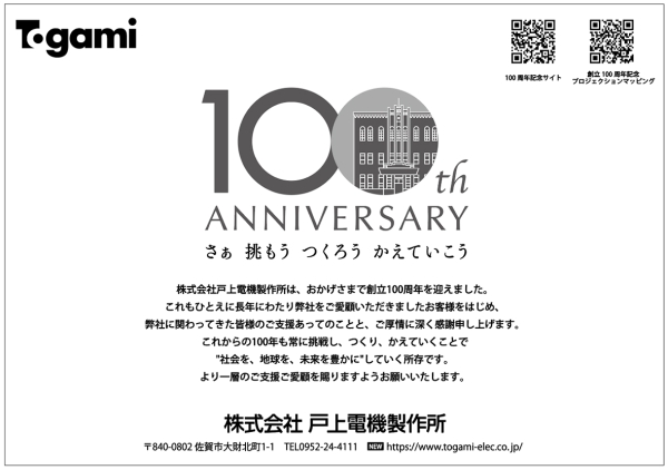 株式会社戸上電気製作所は、おかげさまで創立100周年を迎えました。 これもひとえに長年にわたり弊社をご愛顧いただきましたお客様をはじめ、弊社に関わってきた皆様のご支援あってのことと、ご厚情に深く感謝申し上げます。