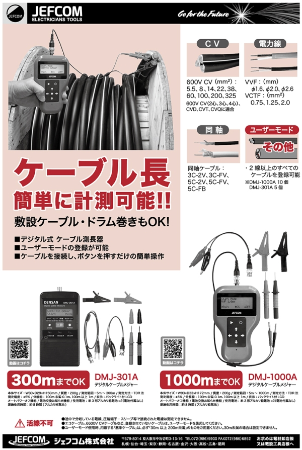 敷設ケーブル・ドラム巻きもOK! デジタル敷き ケーブル測長機 ユーザーモードの登録が可能 ケーブルを接続し、ボタンを押すだけの簡単操作