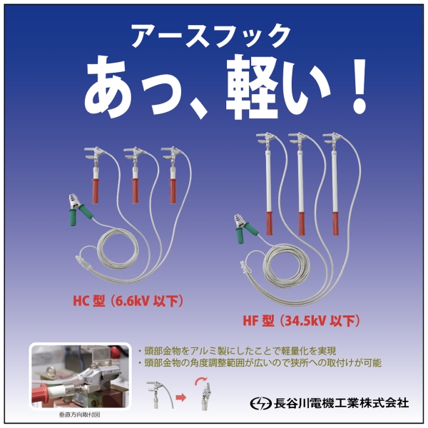 【特長】 ・アルミ製の頭部金物により,当社比で 約40%の軽量化を実現 ・頭部金物の角度調整が最大120度まで 可能となり,従来品より狭所へのアク セスが容易 ・クリップ式の接地金物により操作性が 向上,作業時間が短縮 ・高圧,特高キュービクルで使用ができ る2タイプ(HC/HF型) ・「接地中」の表示ができる収納袋付き